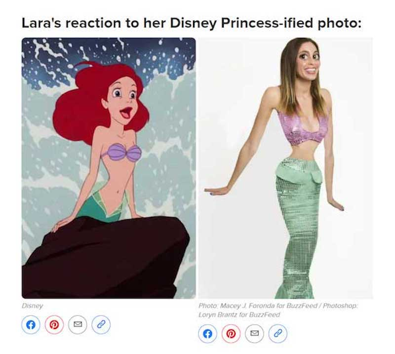 BuzzFeed (bless its heart) published this amazing article in which staffers were Photoshopped into princess proportions. The Little Mermaid one below might be my favorite, as it further illustrates that the princess eyes are really out of proportion.