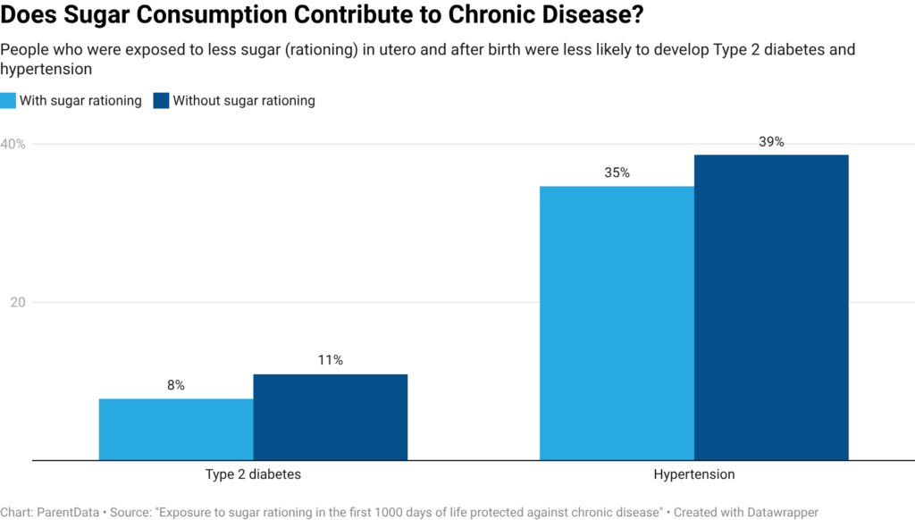 The headline finding of the study is that chronic disease in adulthood — specifically, hypertension and diabetes — is reduced for children who were exposed to less sugar in utero and in their early years of life.