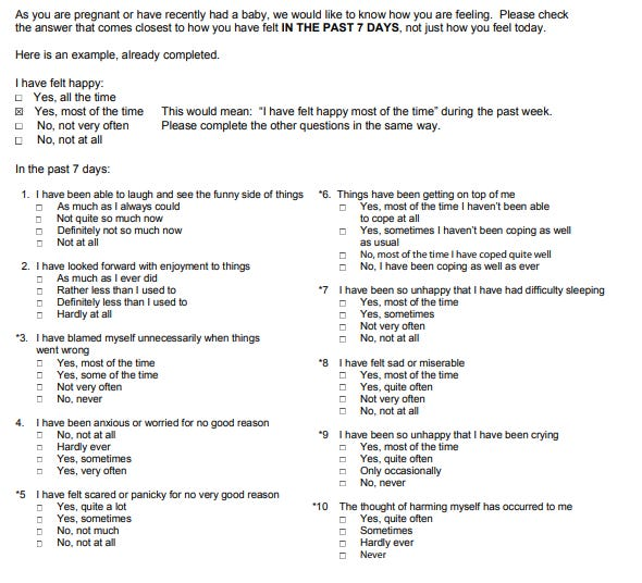 Ideally, every woman is screened for this using a short questionnaire at their six-week postpartum visit. The most widely used questionnaire is probably the Edinburgh Postnatal Depression Scale, though a few others are common. Here’s what it looks like: