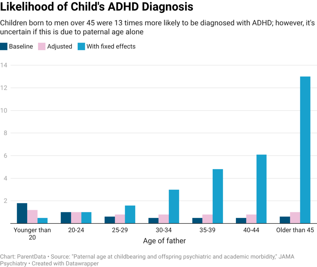 But even more striking and notable were the effects on ADHD diagnosis: relative to children born to men 20 to 24 years old, those who were born to men over 45 were 13 times as likely to be diagnosed with ADHD. Even children born to men 30 to 34 were more than three times as likely to be diagnosed with ADHD as those born to the youngest father group.