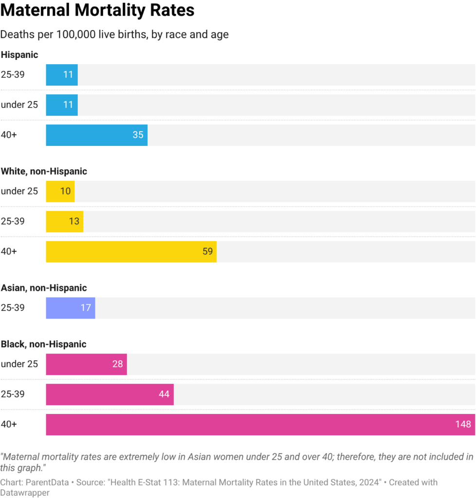 For Black women over 40, the mortality rate is 148 deaths per 100,000 live births. This is more than twice as high as that of white women in this age group. If we focus on the middle age group — 25 to 39 — the mortality rate for Black women is 44 per 100,000 — again, far higher than for white or Hispanic women in this age group.