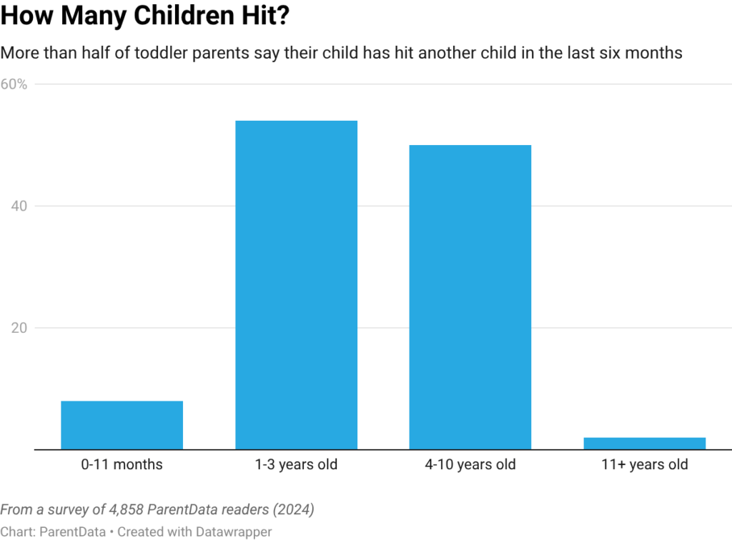 I got curious about what a larger — albeit decidedly non-random — sample of you would say when asked about this. So, in 2024, we surveyed the ParentData audience, and 4,733 of you replied to questions about your child’s hitting behavior.